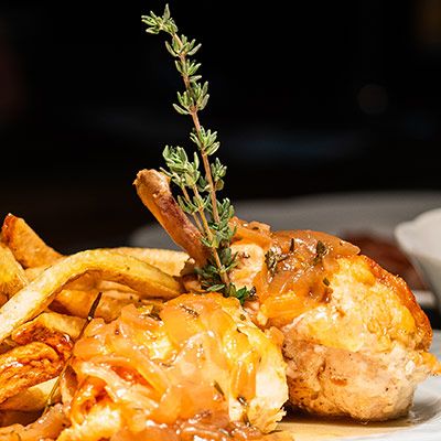 SUPRÊME DE VOLAILLE SAUCE VALLÉE D’AUGE, POMMES ÉCRASÉES ET POMMES FRUITS CONFITES